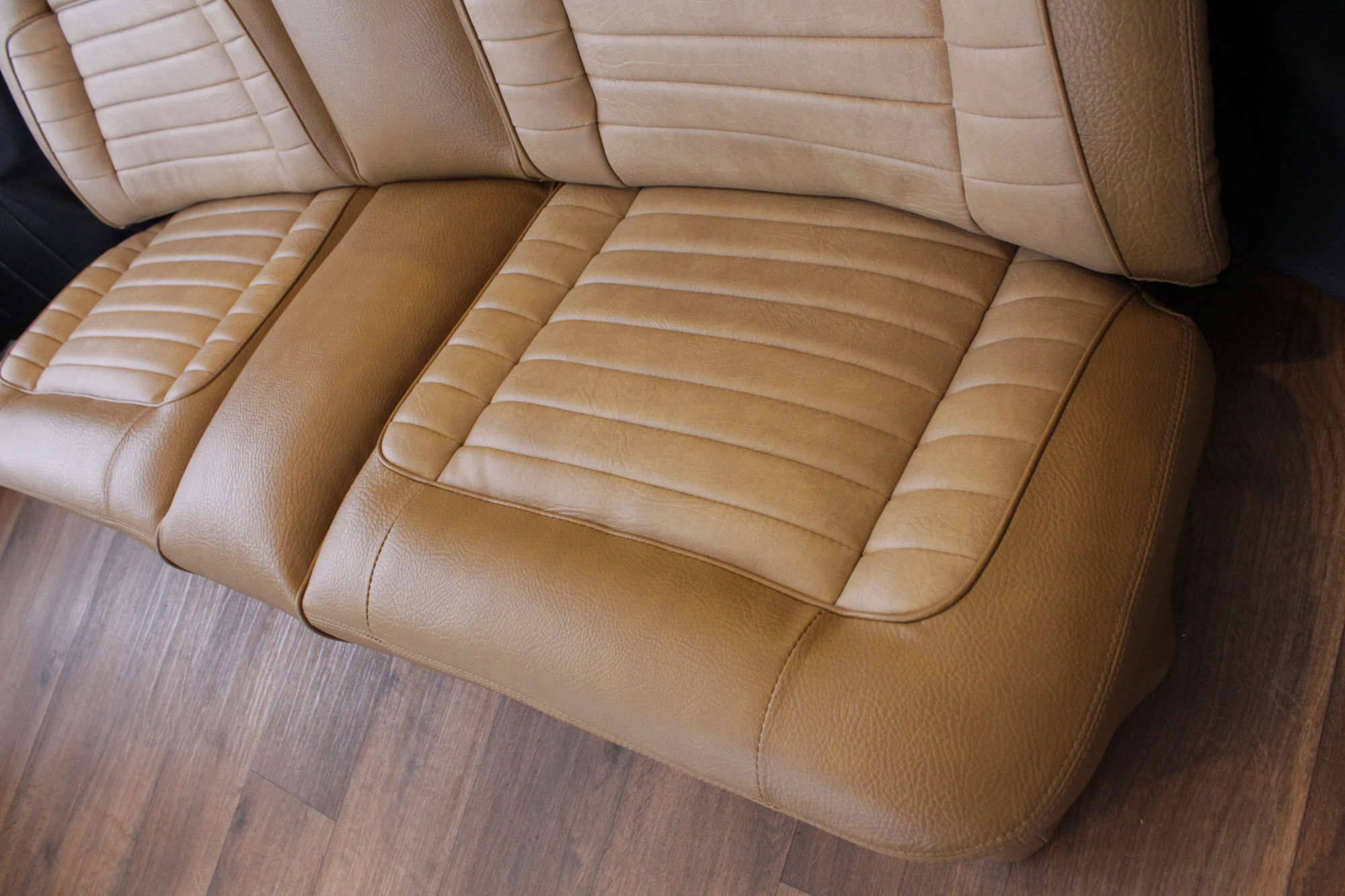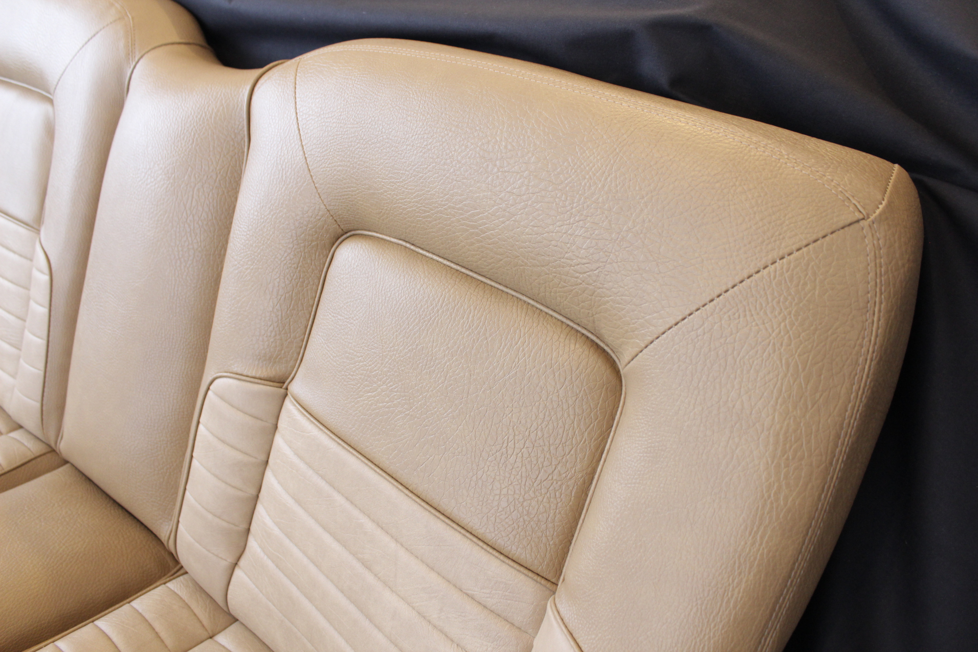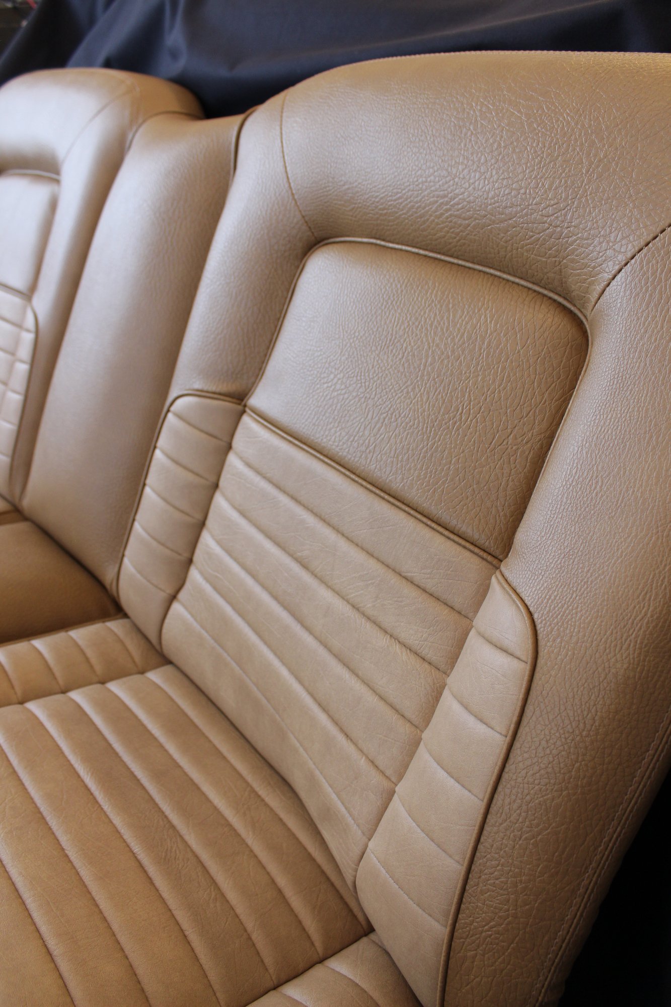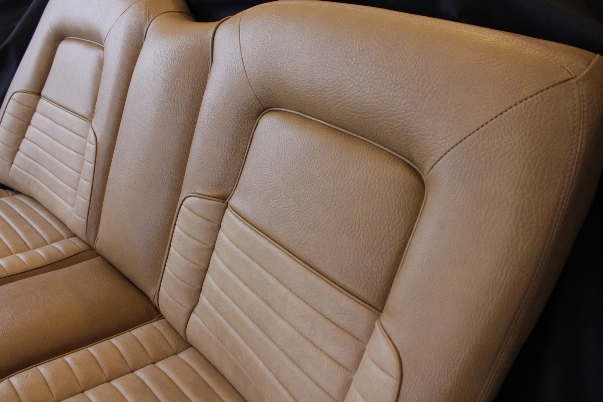 The tan toned vinyl combination is of a very close and decent match to the factory Chrysler vinyl. We opted for a Ford “kiwi light saddle” roebuck vinyl for the outer, and Holden HJ “long grain” for the seats’ pleated inserts. The end result is so very vibrant and looks sun-kissed.