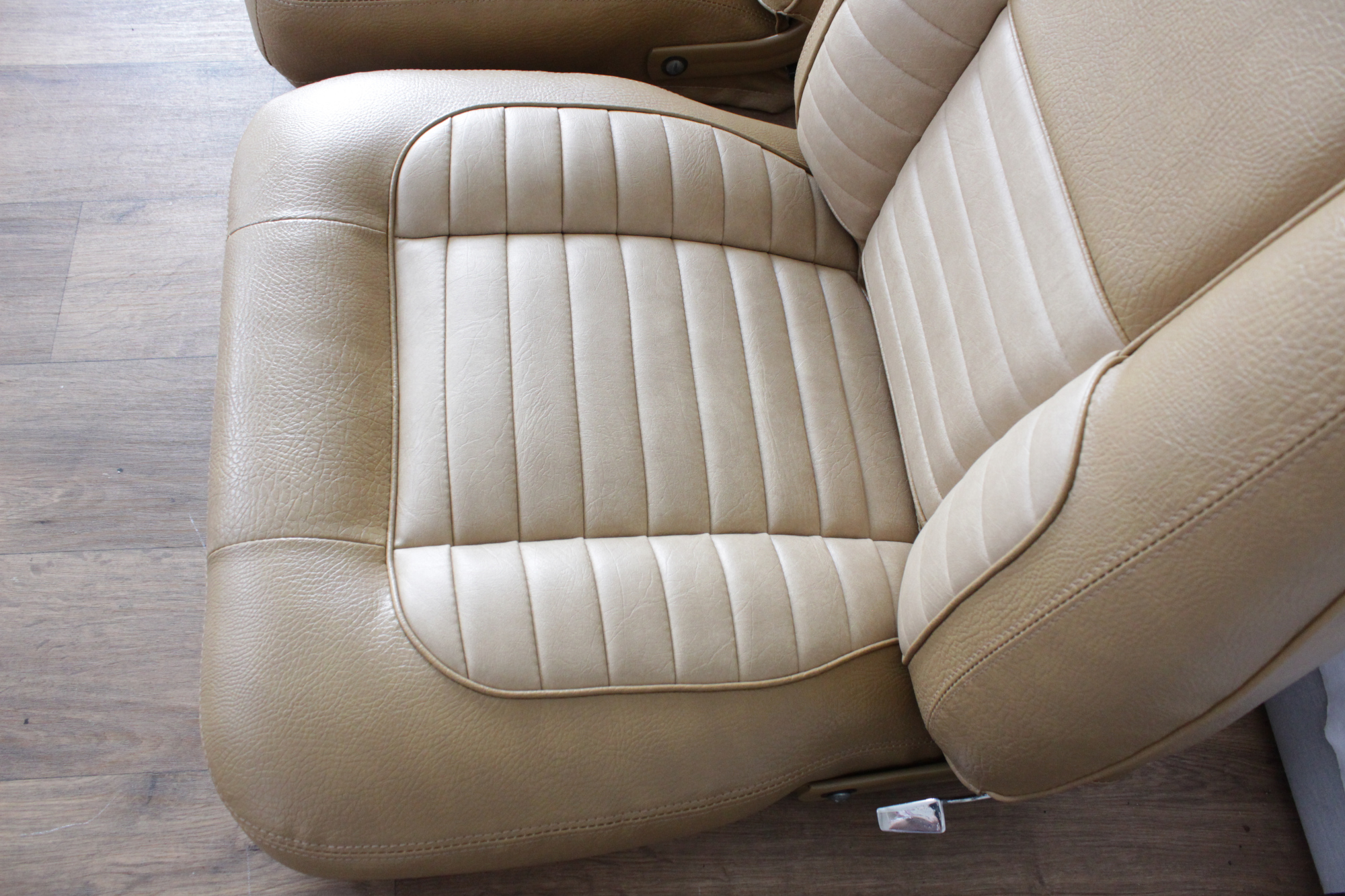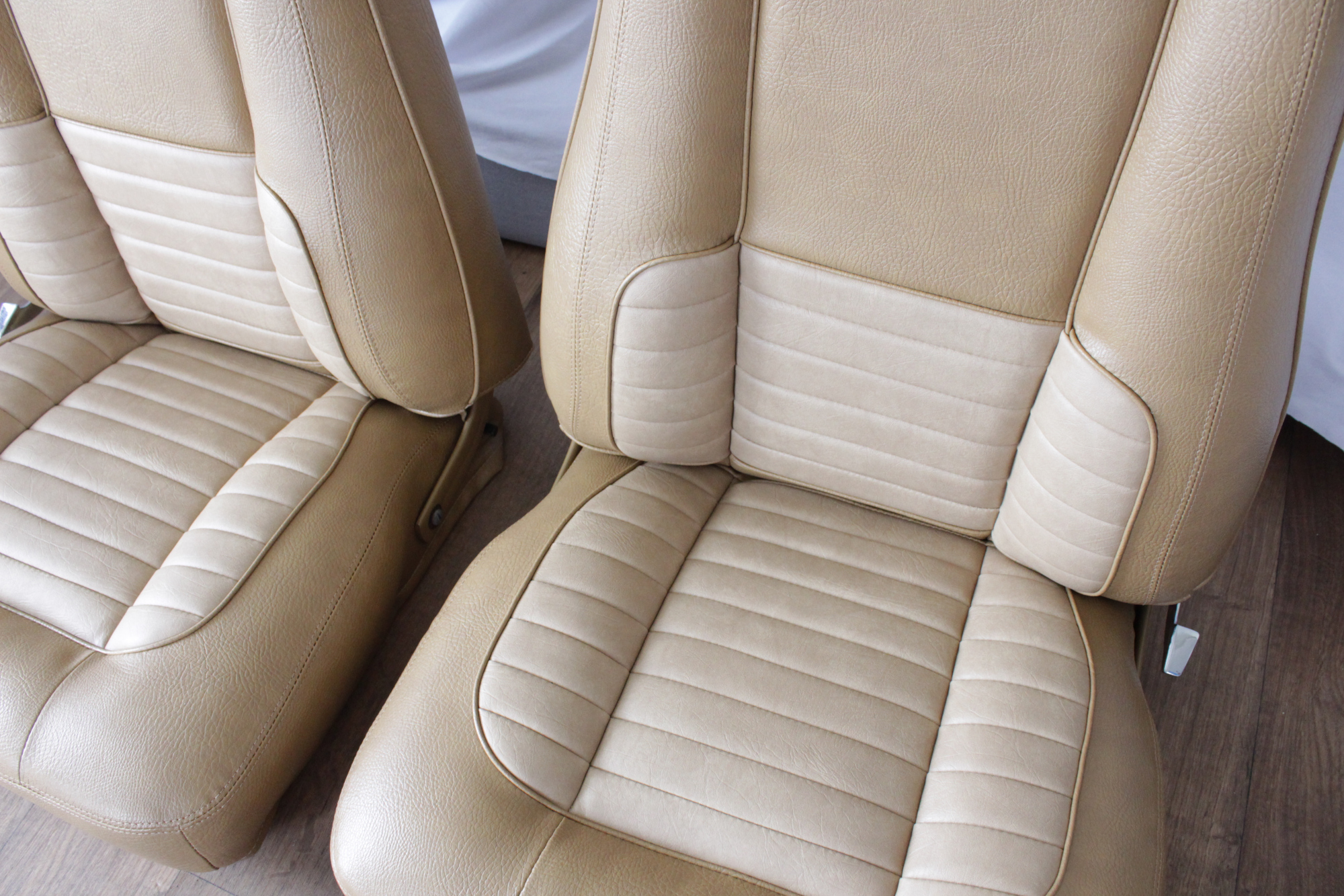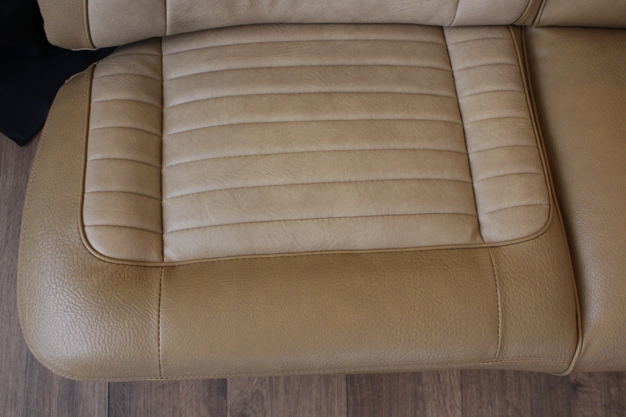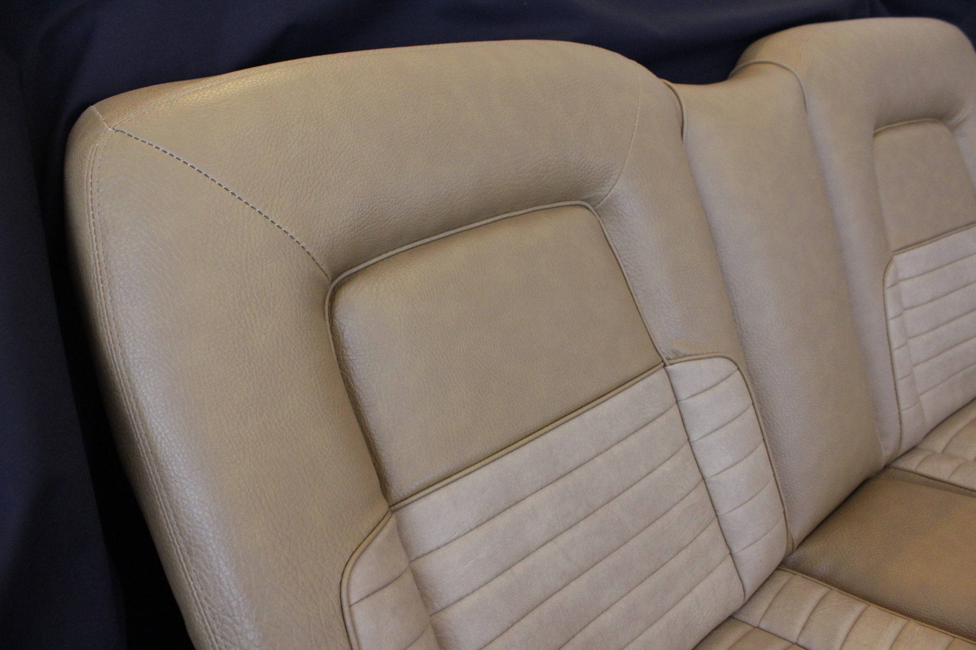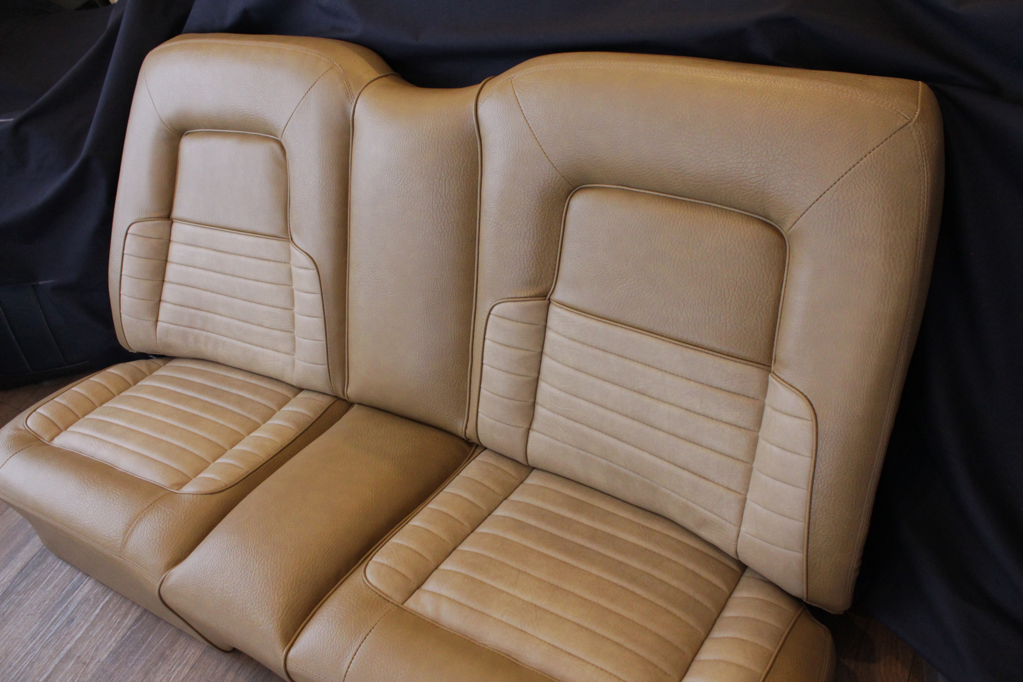 The tan toned vinyl combination is of a very close and decent match to the factory Chrysler vinyl. We opted for a Ford “kiwi light saddle” roebuck vinyl for the outer, and Holden HJ “long grain” for the seats’ pleated inserts. The end result is so very vibrant and looks sun-kissed.