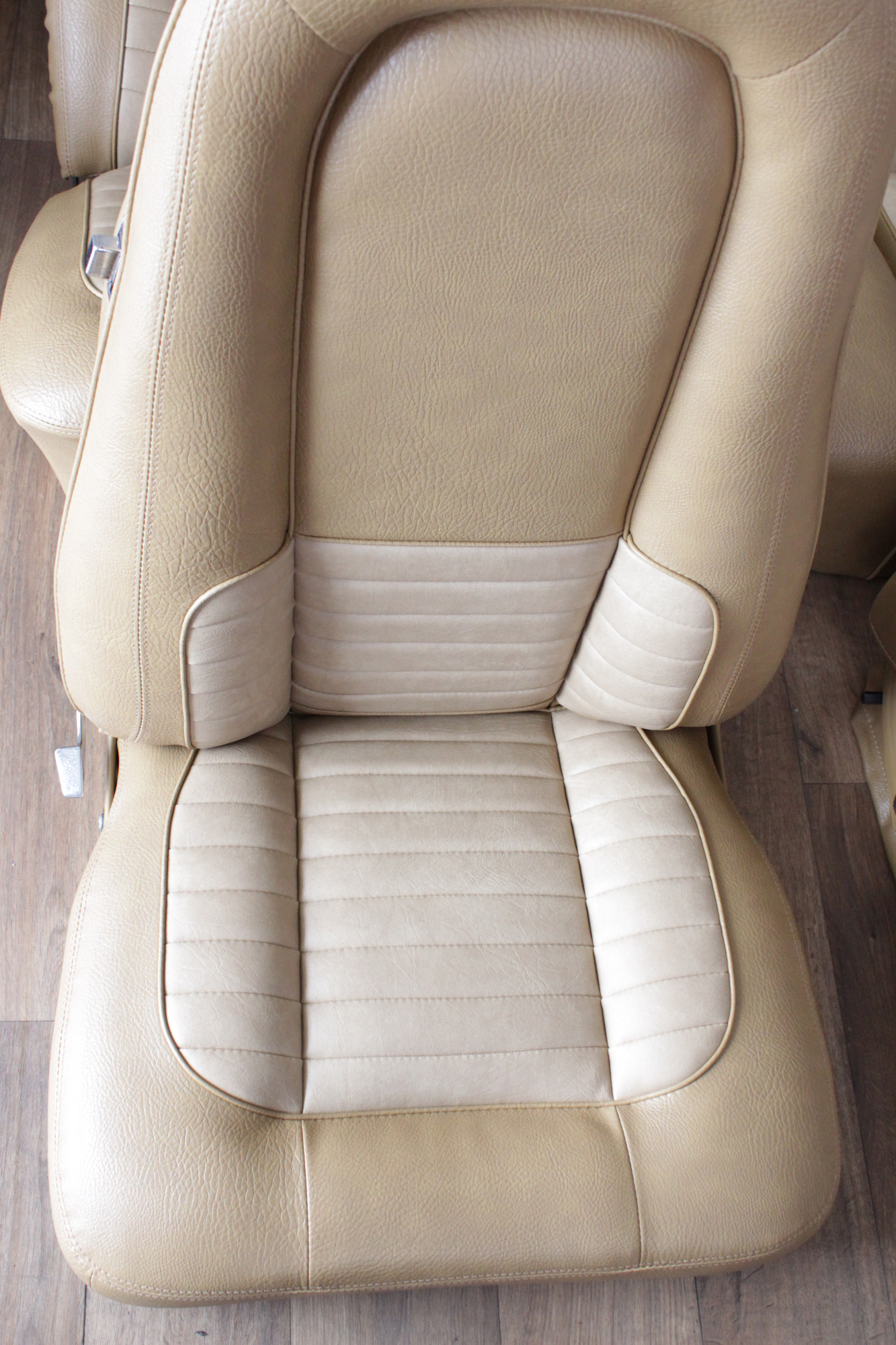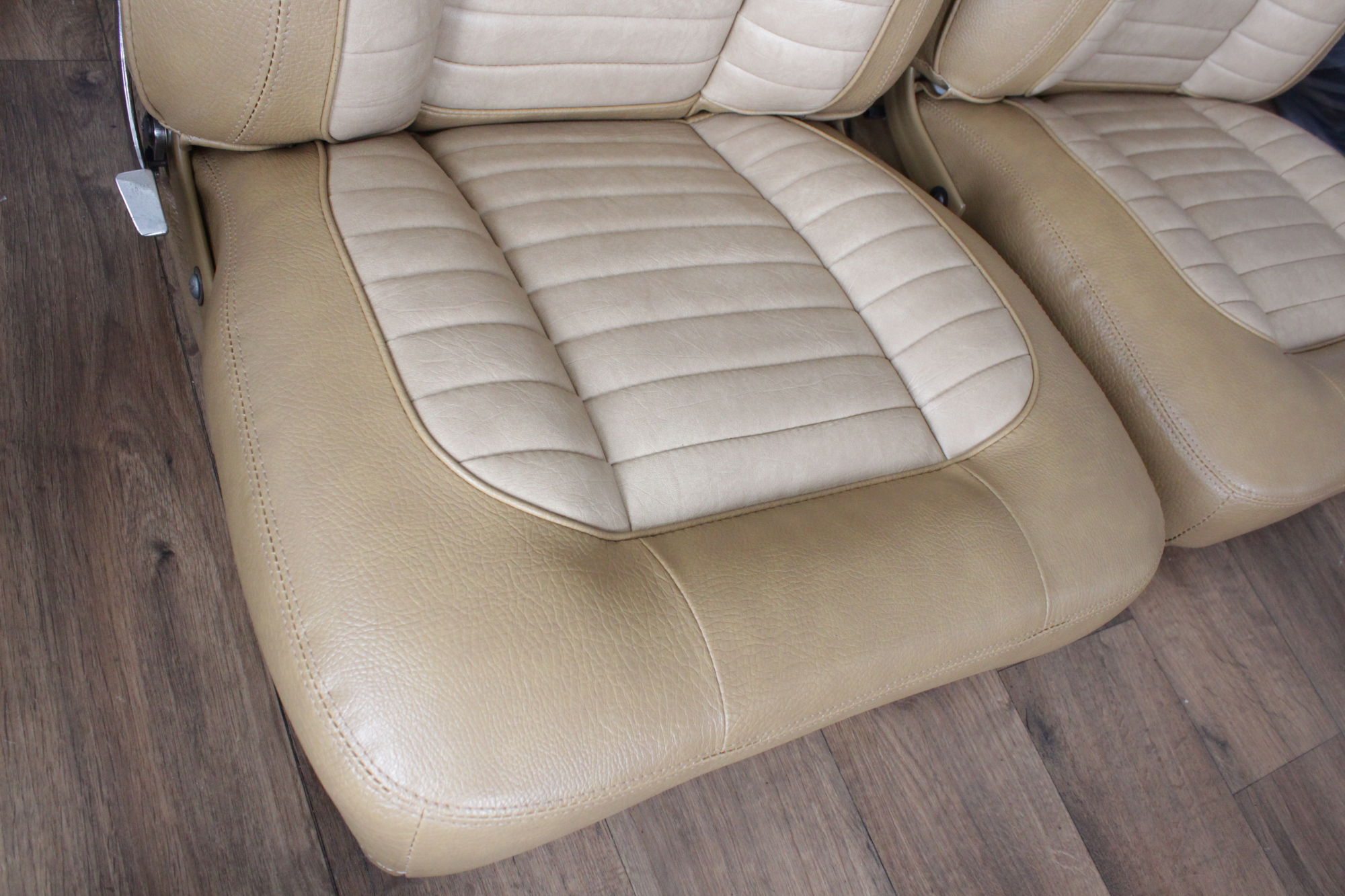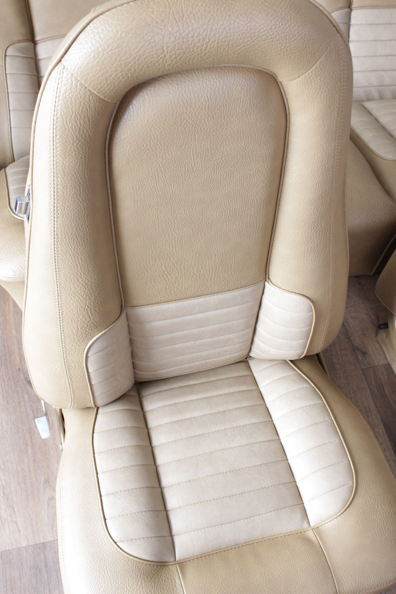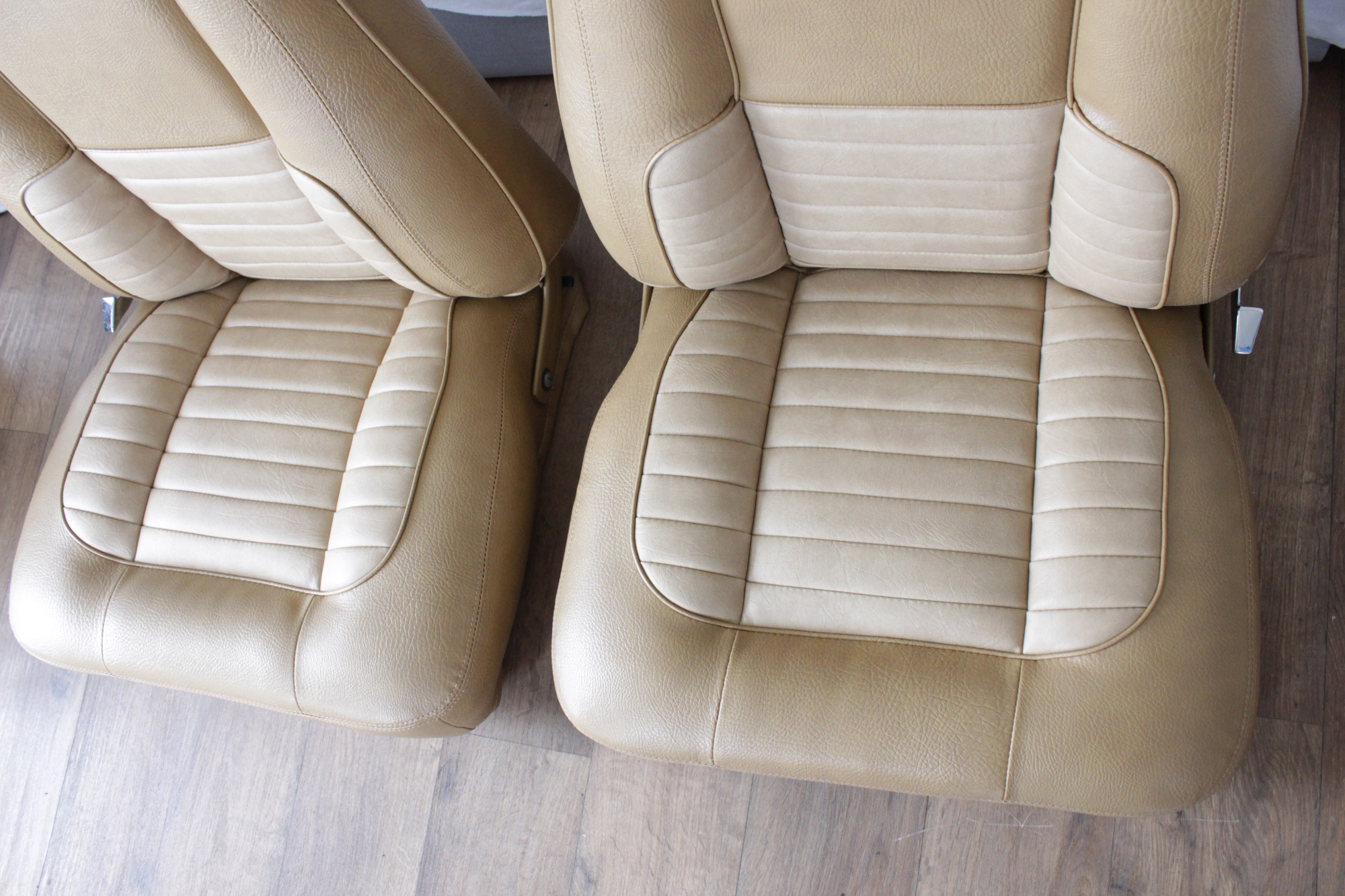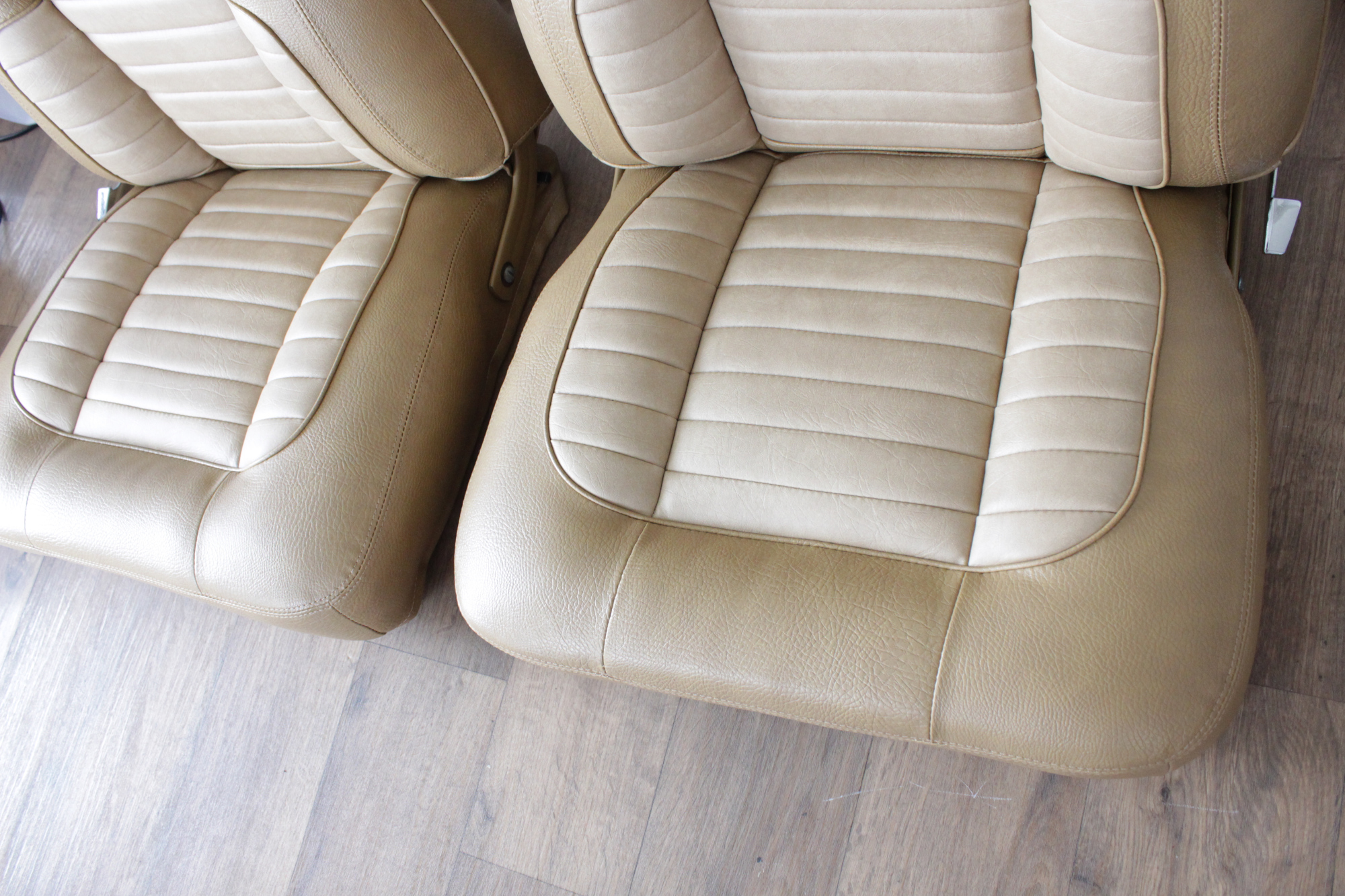 The tan toned vinyl combination is of a very close and decent match to the factory Chrysler vinyl. We opted for a Ford “kiwi light saddle” roebuck vinyl for the outer, and Holden HJ “long grain” for the seats’ pleated inserts. The end result is so very vibrant and looks sun-kissed.